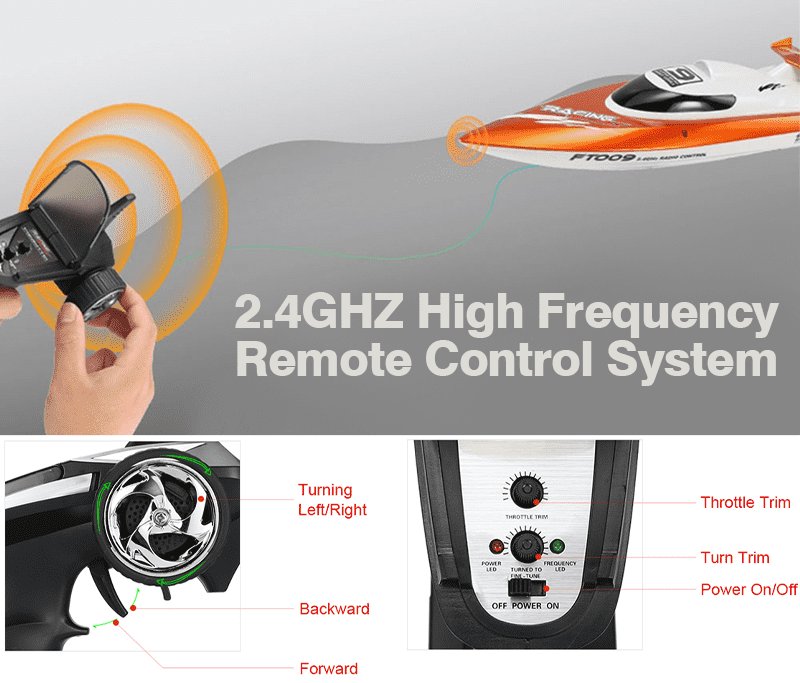 Barca este controlata prin telecomanda si dispune de multiple functii: inainte, inapoi, viraj la stanga, viraj la dreapta, rotire (rasucire) spre stanga si spre dreapta. Protectia impotriva stropilor de pe radiocomanda ajuta la prevenirea daunelor cauzate de apa.