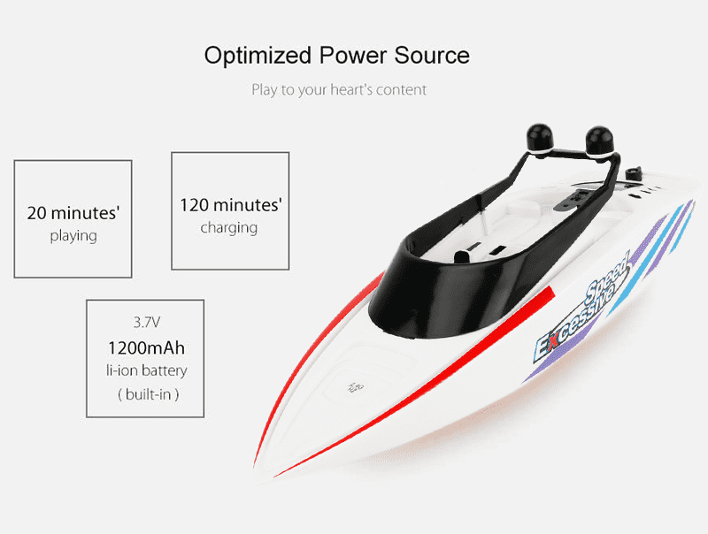 Cu o capacitate a bateriei incorporate de 1200mAh, barca poate fi folosita continuu timp de 18-20 de minute dupa incarcarea completa. Barca este pe deplin functionala numai dupa ce a fost plasata pe suprafata apei si daca bateria sa interna este complet incarcata. Este recomandata pentru piscine, iazuri, bazine si lacuri.