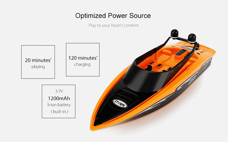 Cu o capacitate a bateriei incorporate de 1200mAh, barca poate fi folosita continuu timp de 18-20 de minute dupa incarcarea completa. Barca este pe deplin functionala numai dupa ce a fost plasata pe suprafata apei si daca bateria sa interna este complet incarcata. Este recomandata pentru piscine, iazuri, bazine si lacuri.