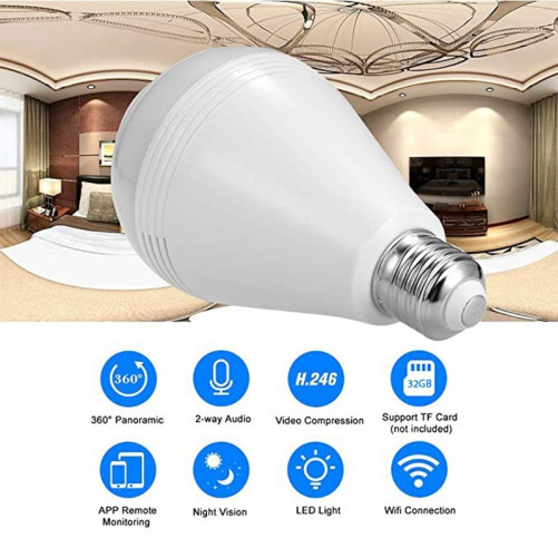 Conceputa pentru a arata ca un bec standard, aceasta camera spion va pacali chiar si cel mai atent ochi. Va permite sa urmariti proprietatea dumneavoastra 24 de ore, 7 zile pe saptamana, iar un unghi de supraveghere de 360 de grade va asigura ca nu aveti niciodata un punct orb. O functie de detectare a miscarii se adauga la capacitatile acestei camere panoramice. Trimite o notificare push catre smartphone-ul dvs., permitandu-va sa monitorizati in timp real.