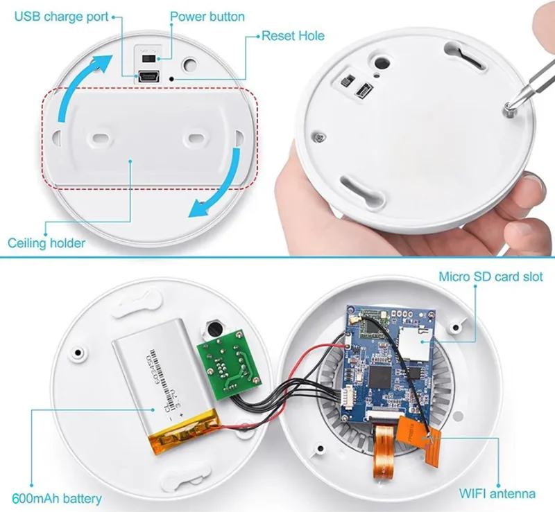 In interiorul detectorului de fum se afla o mica camera spion care poate fi controlata prin intermediul aplicatiei mobile dedicate, asigurand astfel accesul la imagini in timp real sau inregistrarile stocate de-a lungul timpului.