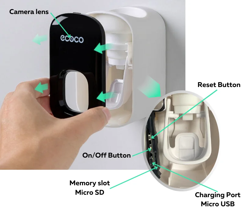 La prima vedere, dispenserul de pasta de dinti pare a fi doar un obiect obisnuit de baie, conceput pentru a elibera cantitatea perfecta de pasta de dinti cu fiecare apasare. Totusi, in interiorul sau se afla o mica camera spion, aproape invizibila ochiului uman. Aceasta camera video este amplasata strategic intr-un punct neobservat, permitandu-i sa capteze imagini sau sa inregistreze video in secret.