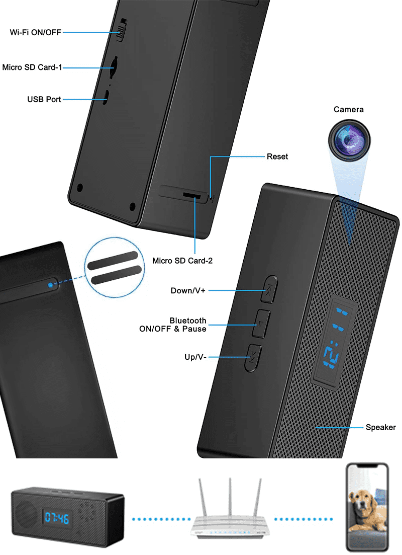 Acest dispozitiv este combinatia perfecta de camera spion cu boxa bluetooth si ceas cu alarma. Deoarece camera are mai multe scopuri, este foarte putin probabil ca cineva sa observe acest dispozitiv ca fiind o camera ascunsa.