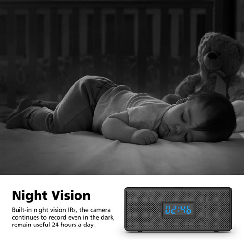 Ceasul cu alarma digital include, de asemenea, o functie de detectare a miscarii, care este folosita pentru a incepe inregistrarea atunci cand o persoana sau un obiect se deplaseaza in raza vizuala a obiectivului. Senzorul are o raza de actiune de 6 metri.