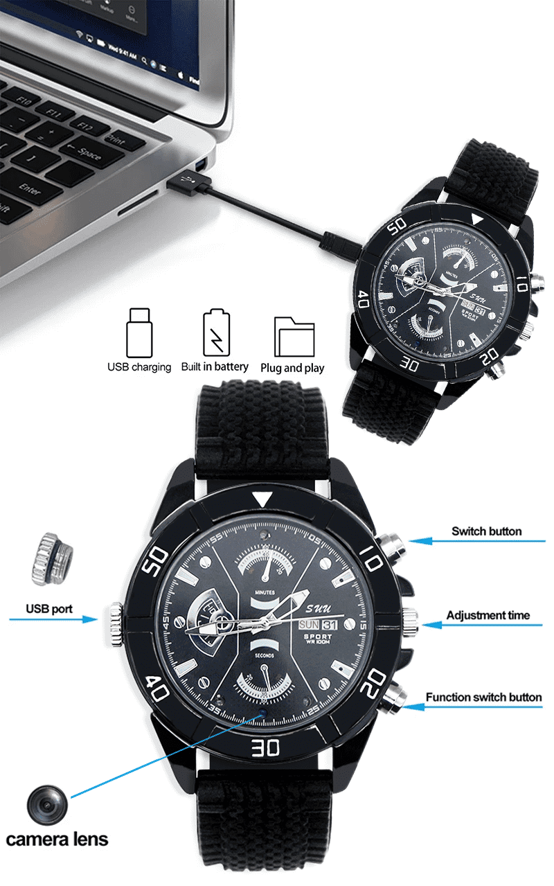 Design elegant si discret – aceasta camera arata exact ca un ceas pentru barbati; este aproape imposibil sa detectezi cu ochiul liber obiectivul camerei spion din cadranul ceasului, iar portul de conectare USB este proiectat sa arate ca un alt buton, asa ca nimeni nu va banui ca este un dispozitiv de supraveghere.