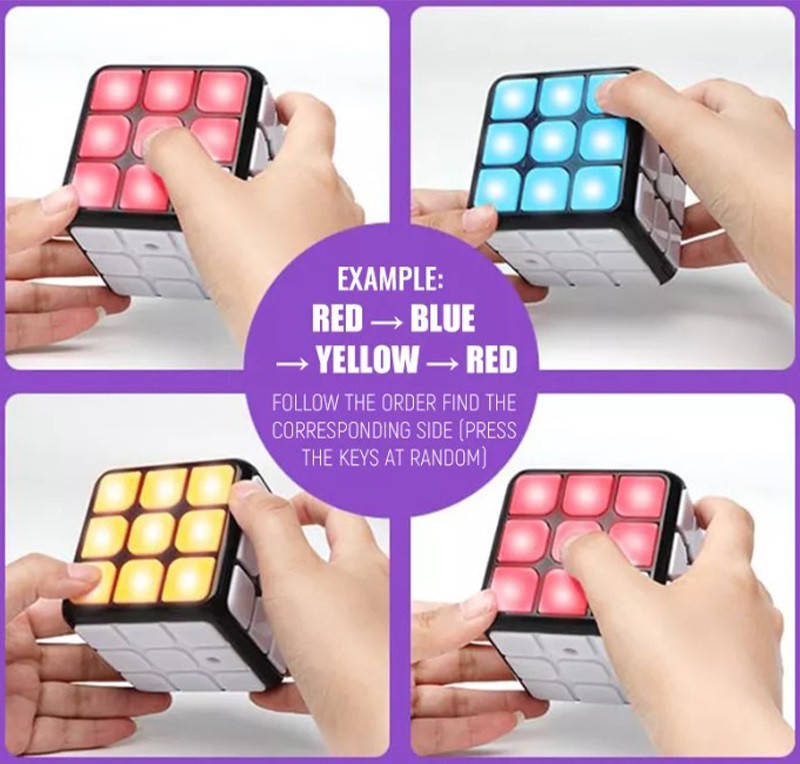 La inceputul jocului, o parte a cubului se va aprinde cu un model de 3 culori pe panoul frontal. Celelalte 3 panouri ale cubului vor ramane iluminate. Potriviti modelul de lumina corespunzator cu fiecare parte a cubului. De exemplu, daca se aprinde rosu in pictograma din mijloc a panoului frontal, va trebui sa selectati pictograma din mijloc a panoului rosu. Pe masura ce jocul continua, cu atat mai repede va trebui sa finalizati fiecare model. Exista 7 niveluri in timpul jocului.