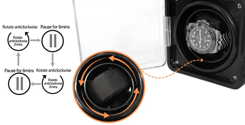 Cu ajutorul acestui program de rotatii, cutia va roti ceasurile intr-un mod specific, imitand miscarea mainii tale atunci cand porti ceasul.