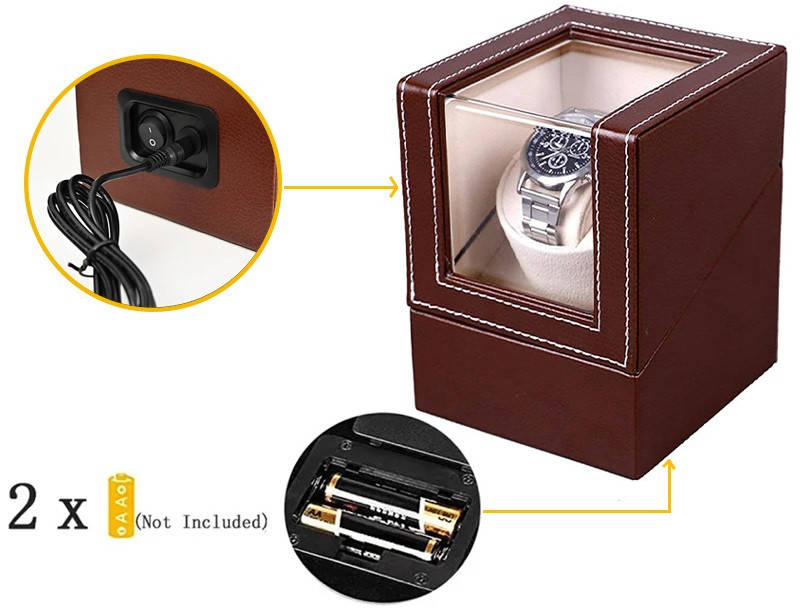 Exista doua optumeline pentru a alimenta cu energie cutia de intors ceasuri automatice – prin intermediul adaptorului furnizat sau cu ajutorul a doua baterii de tip AA(nu sunt incluse in pachet).