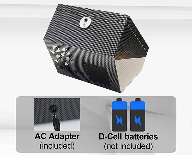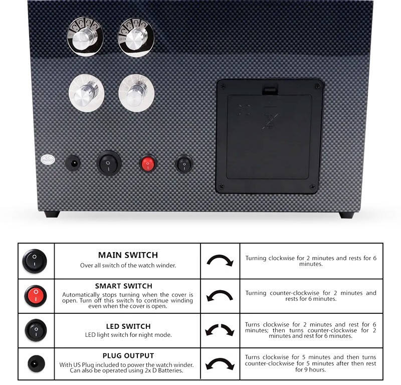 Exista doua optumeline pentru a alimenta cu energie cutia de intors ceasuri automatice – prin intermediul adaptorului furnizat sau cu ajutorul a doua baterii de tip R20(nu sunt incluse in pachet).