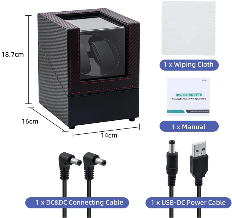 • Accesorii incluse: 1*cablu alimentare USB-DC, 1*cablu DC-DC(pentru conectare mai multe watch winders in serie), 1*manual de utilizare, 1*laveta din microfibra