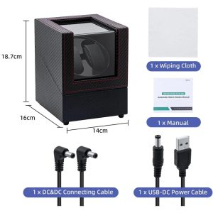 • Accesorii incluse: 1*cablu alimentare USB-DC, 1*cablu DC-DC(pentru conectare mai multe watch winders in serie), 1*manual de utilizare, 1*laveta din microfibra