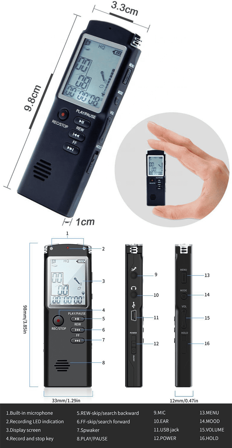 Design cu aspect profesional, usor de transportat – pentru a va oferi mai multa usurinta, acest reportofon in miniatura are doar 97 mm lungime, 33 mm latime si doar 11 mm grosime.