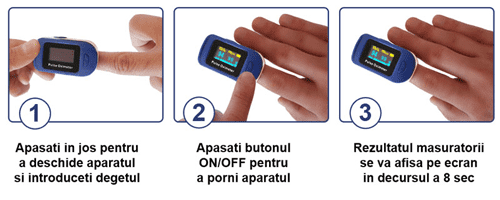 Pulsoximetrul este un dispozitiv portabil, comod, non-invaziv, care este utilizat pentru monitorizarea saturatiei de oxigen (SpO2) si a pulsului. Este destinat pacientilor adulti (greutate>= 30kg). Pentru o pozitie mai buna de monitorizare se recomanda atasarea dispozitivului pe degetul aratator, mijlociu sau inelar. Pulsoximetrul este destinat pentru verificari de urgenta sau monitorizare de ingrijire la domiciliu.