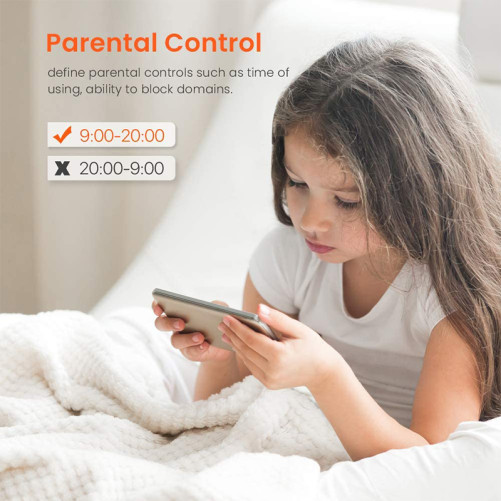 Functiile de filtrare client, adresa MAC, si website permit definirea unor parametri pentru control parental precum perioade programate, blocarea domeniilor, si nu numai.