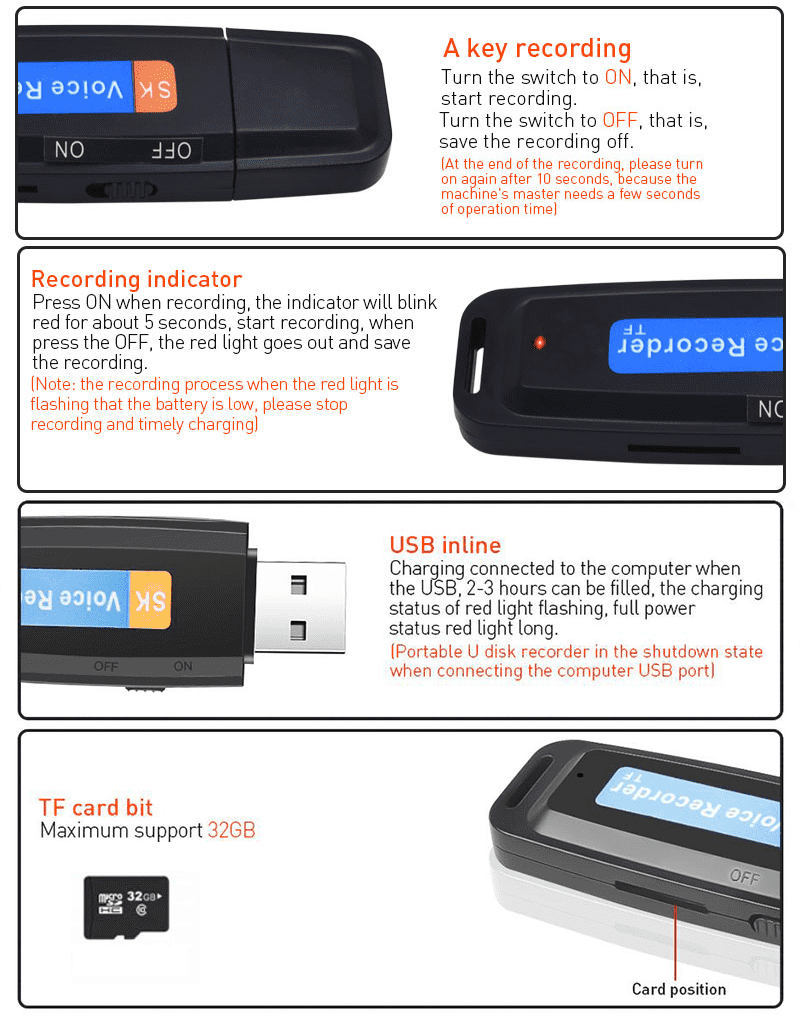 2. Pentru a incepe inregistrarea va rugam sa comutati in pozitia „ON”. Dupa ce indicatorul rosu clipeste timp de 5 secunde, reportofonul va incepe sa inregistreze tot ce este in apropiere. Pentru a salva inregistrarea comutati in pozitia „OFF”, lumina rosie este stinsa si inregistrarea nu mai functioneaza.
