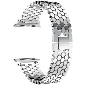 Aceasta bratara de culoare Silver (nuanta, tonul si intensitatea culorii pot varia in functie de monitor) este special conceputa pentru utilizatorii de Apple Watch 1/2/3/4/5/SE/6/7 cu dimensiunea de 44 mm.