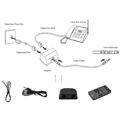 Reportofonul dispune de un adaptor si un cablu RJ11 care iti permit montarea si inregistrarea conversatiilor purtate la telefonul fix. Te rugam sa retii ca aceasta functie nu este compatibila cu un telefon mobil.