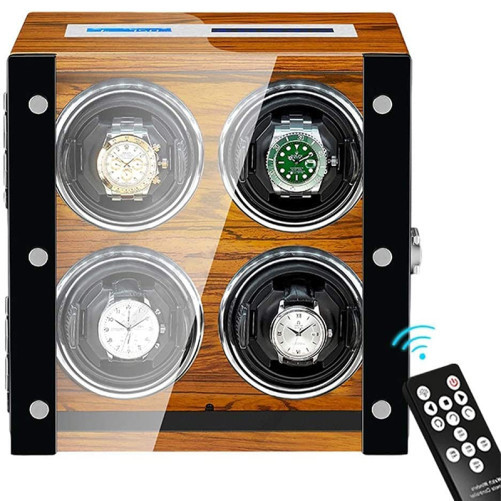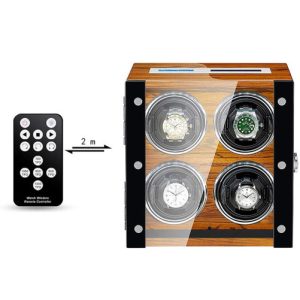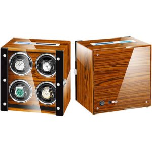 Acest watch winder este un cadou practic si cu stil destinat colectionarilor de ceasuri automatice. Cutia este realizata din lemn de pin de inalta calitate si este prevazuta cu un geam exterior cu dublu rol, acela de a proteja ceasurile aflate pe rotoare, dar si de a-i permite destinatarului sa-si admire ceasurile pe cele patru rotoare.