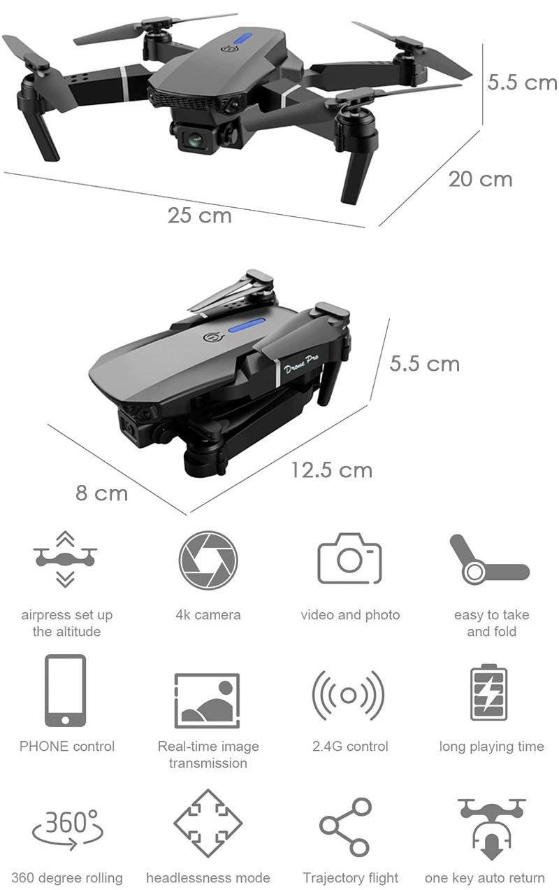 Drona umeline E88 Pro este dotata in partea din fata si in partea inferioara cu doua camere 4K, care va permit sa capturati imagini de inalta calitate. Fotografiile originale facute in timpul zborului pot fi salvate automat pe dispozitivul mobil fara a fi nevoie sa le scoateti manual din drona.