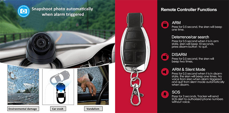 GPS Tracker-ul are o camera inclusa care face poze persoanei care declanseaza alarma masinii. Va puteti conecta rapid si usor la internet si puteti vedea fotografiile facute de camera. Datorita camerei, veti putea avea poze cu persoana care va „imprumuta” masina.
