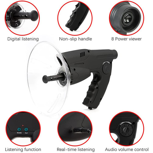 Microfonul incorporat va permite sa auziti sunete pana la 100 m distanta. Doar indreptati-l catre sursa de sunet pe care doriti sa o amplificati, tineti apasat pe tragaci, iar dispozitivul se va ocupa de colectarea sunetului, amplificarea acestuia si trimiterea la casti, astfel incat sa il puteti auzi. Acest lucru il face gadgetul perfect in aer liber pentru a observa natura fara a deranja animalele.