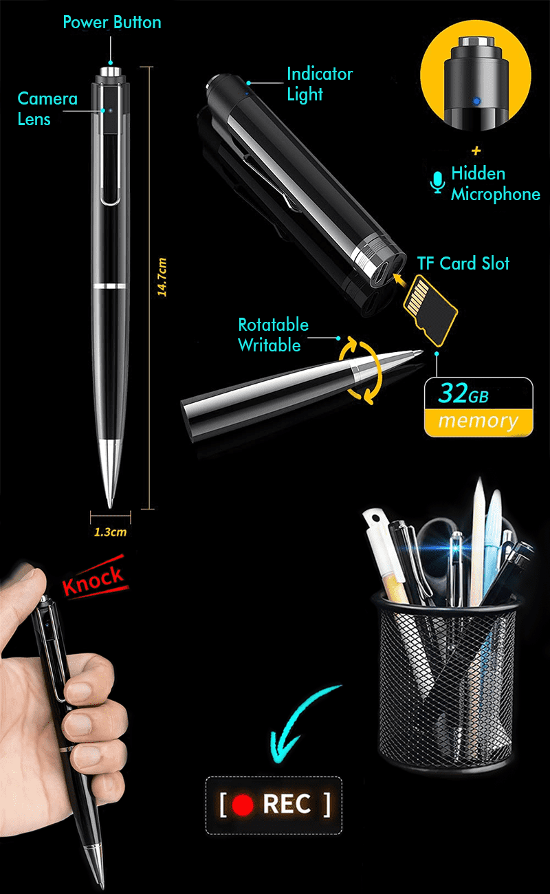 Printr-un orificiu mic din pix, acesta inregistreaza videoclipuri de calitate 1080p la 30 FPS. Este nevoie de un card micro SD de 32 GB (nu este inclus) si va salveaza automat inregistrarile audio si video. Cu functia de inregistrare in bucla, camera spion va suprascrie automat imaginile vechi.