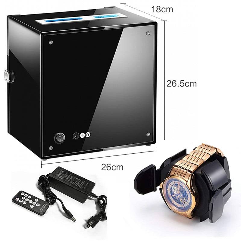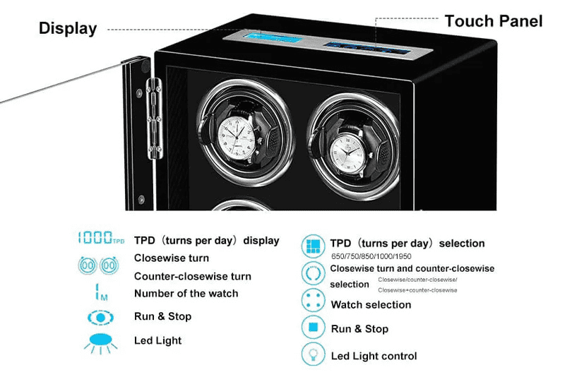 Cutia poate mentine in miscare patru ceasuri simultan. Rotoarele pot fi programate sa functioneze independent. Poti seta un program individual pentru fiecare rotor, in functie de modelul de ceas pe care il plasezi. Poti alege numarul de rotatii pe zi de la 650 la 1950 TPD(Turns Per Day) in combinatie cu orice directie de rotatie. Ecranul tactil LCD si telecomanda inclusa iti permit o configurare usoara.